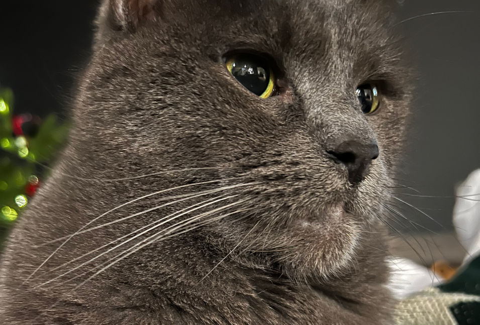 We have two cats, Catness an all grey cat with gold colored eyes who makes a purr'fect lap heater and Charlie a black and white tuxedo cat with green eyes and a black mustache!